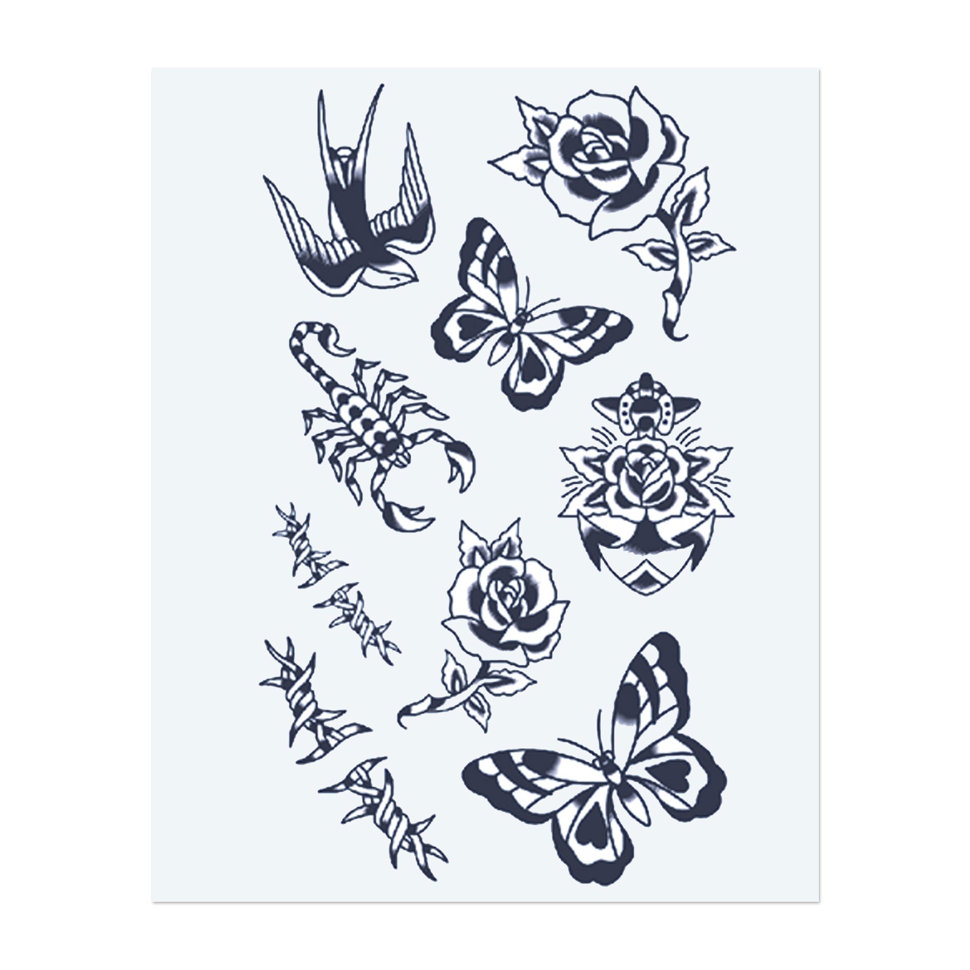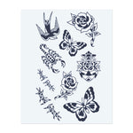 Un insieme di simboli contrastanti: rondini in volo, uno scorpione, farfalle vivaci, rose in fiore e una coccinella. Questi disegni combinano la bellezza della natura con il pericolo e catturano temi come libertà, trasformazione e forza.
