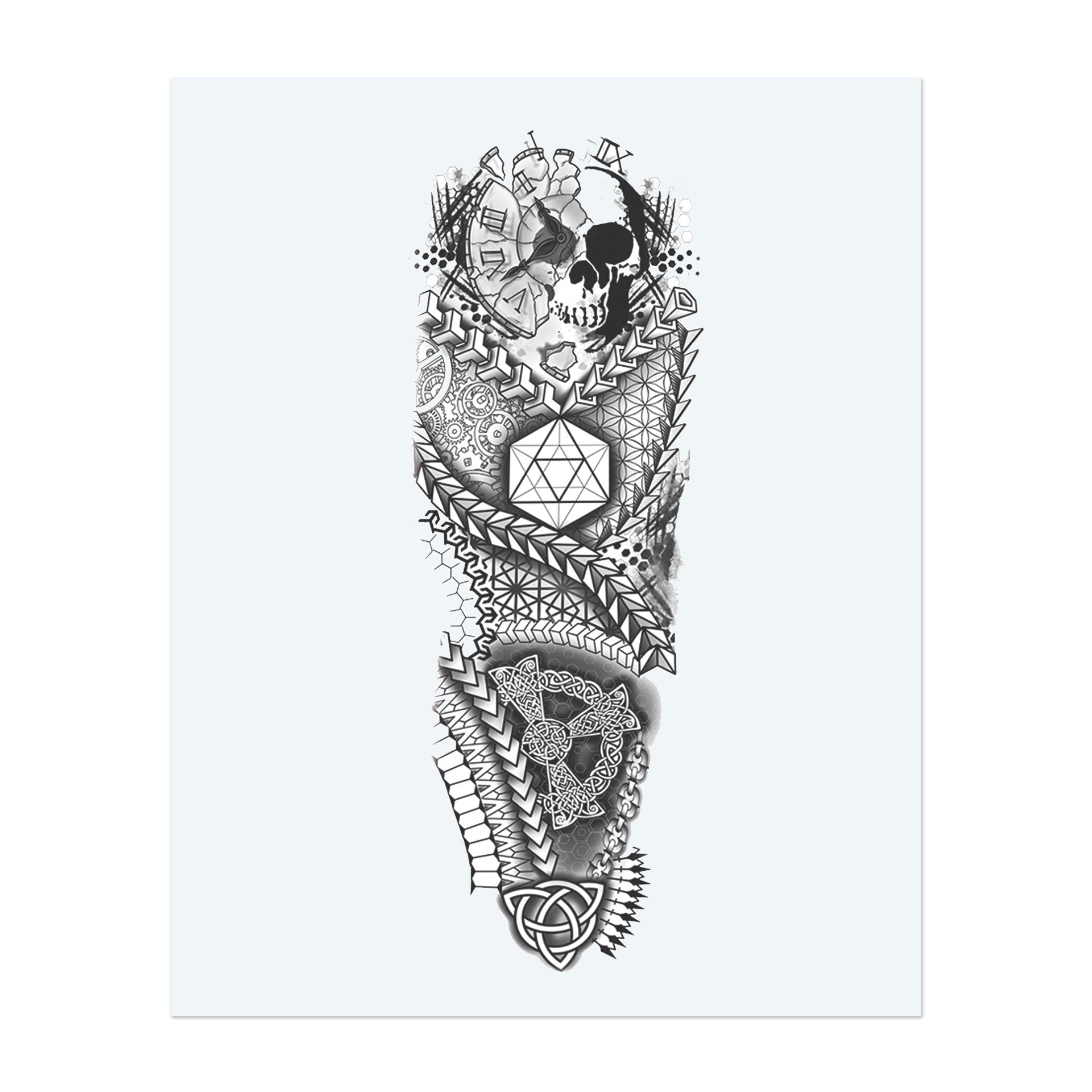Un teschio frantumato appare tra quadranti di orologi rotti e intricati disegni geometrici che si trasformano in nodi celtici e motivi frattali. Combinando mortalità, tempo e geometria sacra, questo tatuaggio è un tributo multiforme alla fragile e materica bellezza della vita.