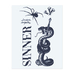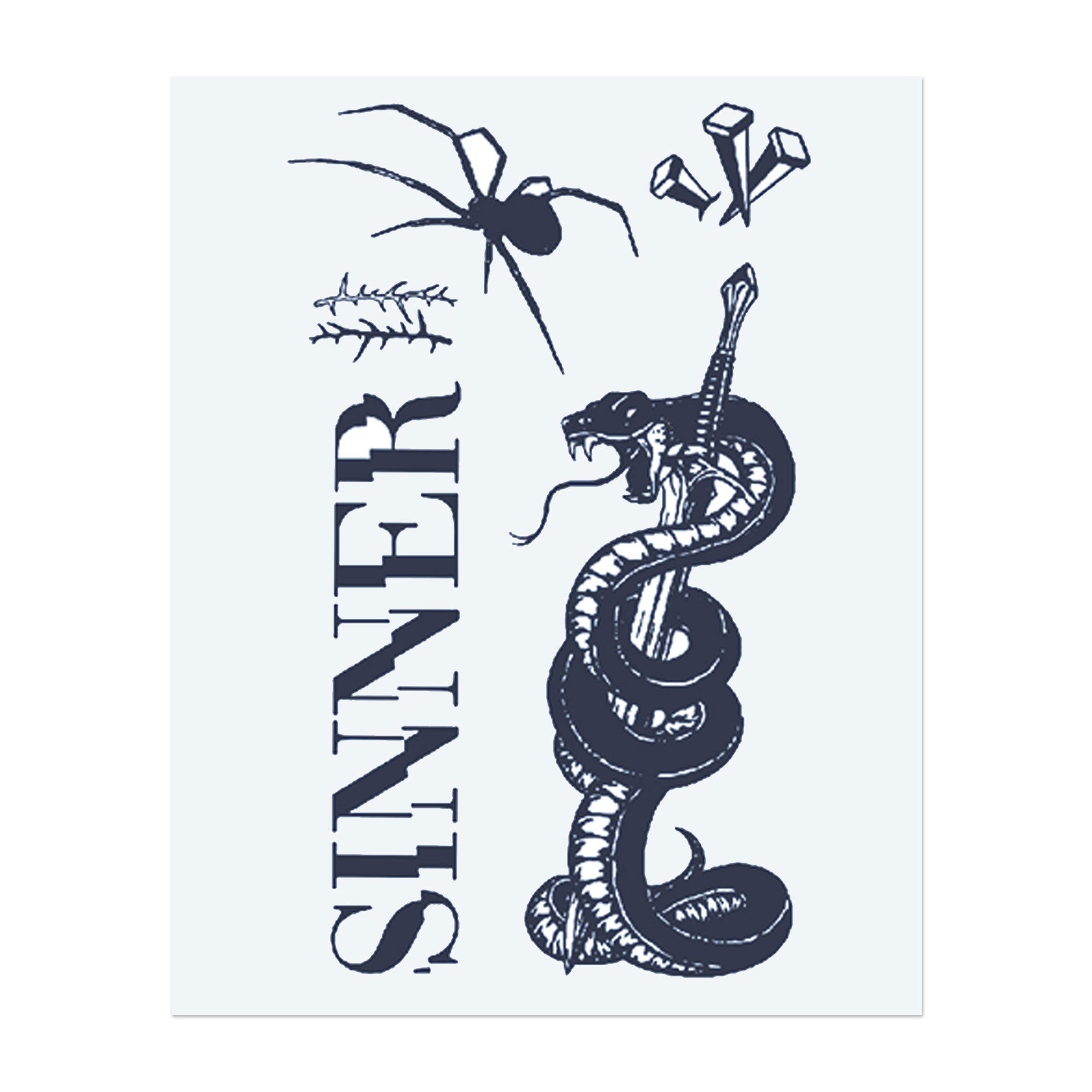 Un insieme di simboli potenti: un ragno, una spina, un serpente avvolto attorno a una chitarra e la parola "SINNER". Questi disegni evocano pericolo, ribellione e potere, combinando immagini oscure con un atteggiamento audace.