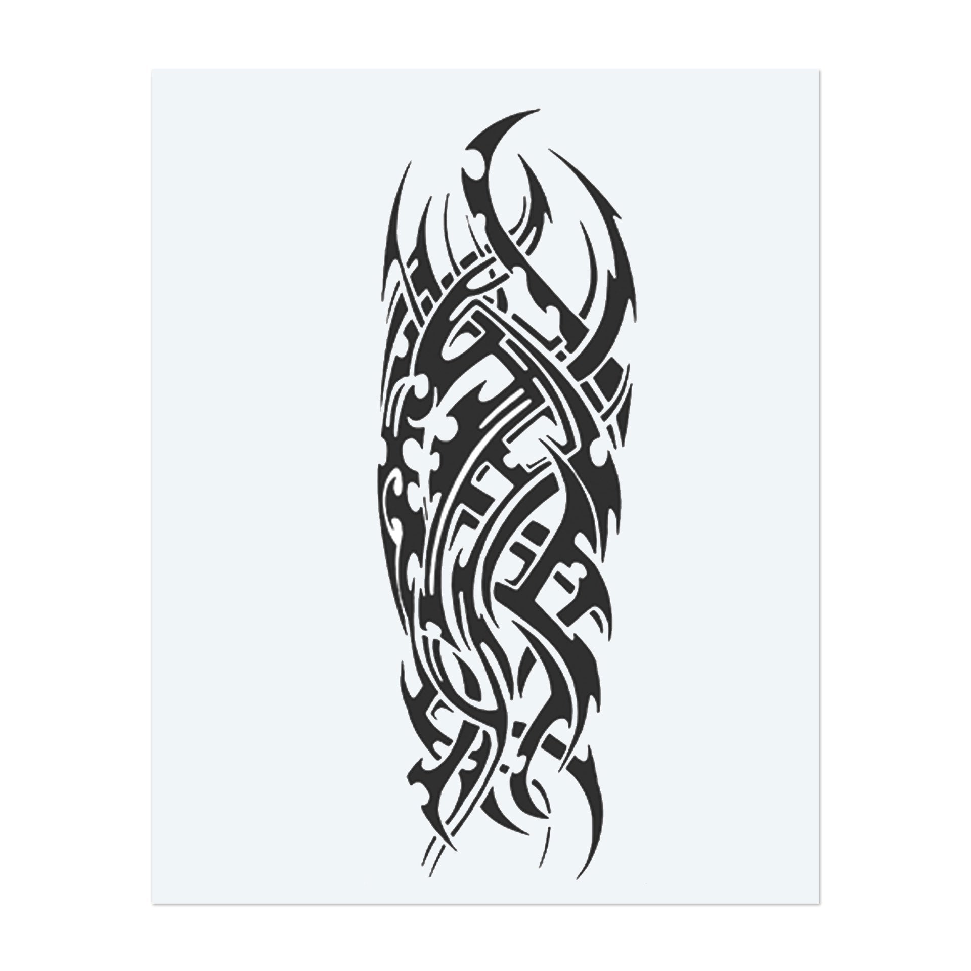 Questo sorprendente tatuaggio tribale combina curve nette, simili a fiamme, e forme nere interconnesse per creare un motivo fluido e astratto. Risveglia energia e potere primordiali e simboleggia resilienza, istinto e uno spirito indomito in una composizione elegante e potente.