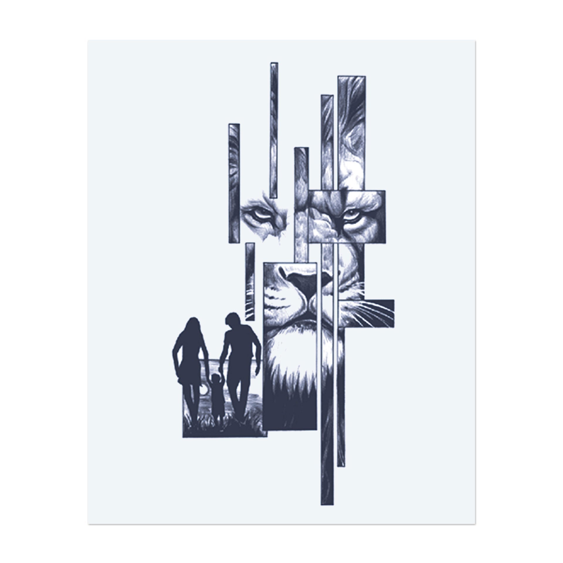 Una famiglia che si tiene per mano cammina insieme sotto lo sguardo vigile di un leone. Questo tatuaggio realistico con barre geometriche illustra amore, forza e protezione familiare in uno stile moderno.
